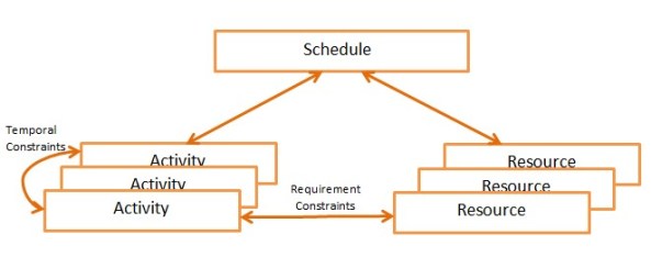 The Schedule is defined in time and has origin (start) and horizon (end).  The Schedule usually consists of activities, resources, and different relationships between them. Activities may have known or unknown start, duration and end, and we may assume that there is a natural constraint between them (start + duration = end). There can be precedence relationships between activities such as “Job A start after the end of the job B”. These relationships are usually called “temporal constraints”.