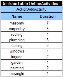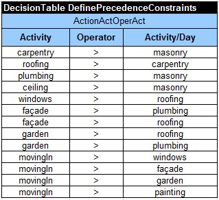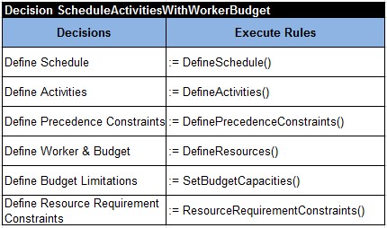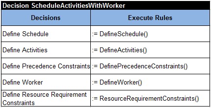 To model this, pure scheduling, problem I will use OpenRules Rule Solver and Excel-based decision tables placed only in one file “Decision.xls”. Our decision “ScheduleActivities” can be defined in the following decision table through 3 sub-decisions: