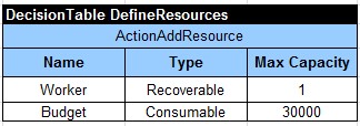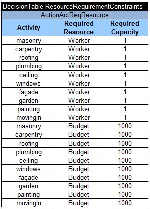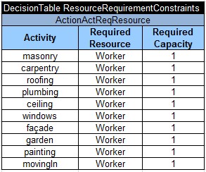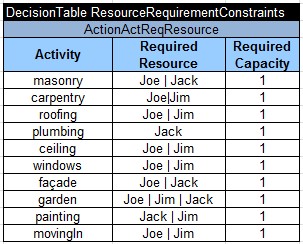 The next decision table is similar to previous “ResourceRequirementConstraint” tables but lists different alternative resources separated by the or-sign “|”: