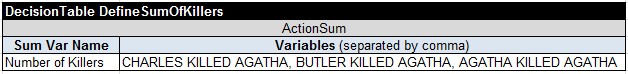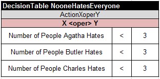 In my decision tables I freely introduced various decision variables in plain English (like “Agatha Hates Butler”) on as needed basis. The very first rule “A killer always hates, and is no richer than his victim” can be specified as follows: