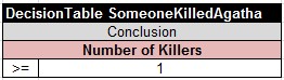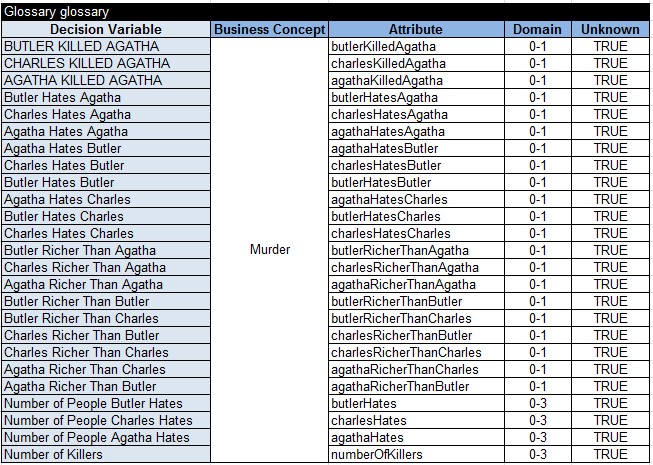 As you may guess, the first rule states: “If BUTLER KILLED AGATHA is true, Then Butler Hates Agatha is true (1)”. The second rules states: If BUTLER KILLED AGATHA is true, Then Butler Richer Than Agatha is false (0)”. You got the picture. It is also important to understand that when the Rule Solver will process this table, it would not treat it as traditional single-hit or multi-hit decision tables. Instead, it will create a constraint satisfaction problem and will post the proper conditional constraints for ALL rules in such tables (the order of rules is not important).