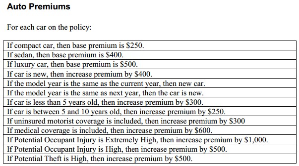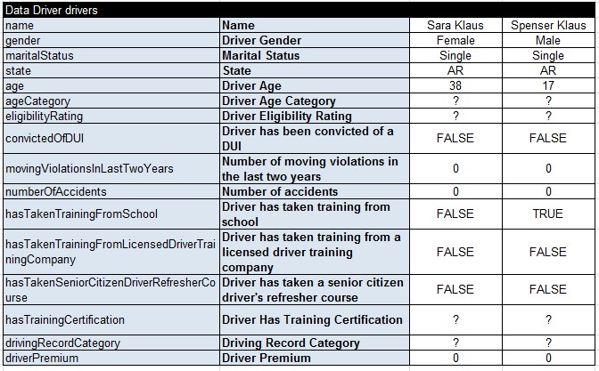 - Eligibility and premium calculation rules that should be applied to all drivers and all cars
