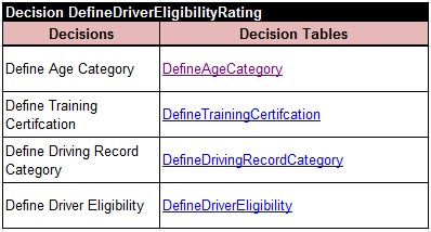 The decision “DefineDriverEligibilityRating” consists of 3 sub-decisions: