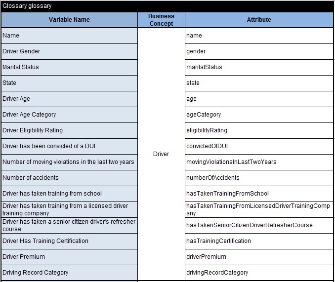 The first column represents business names of decision variables as they are being used inside rules. The second column represent business concepts (Driver, Car, Client) to which these variables belong. The third column represents technical names (no spaces) used to map the decision variables to attributes inside implementation objects corresponding to business concepts.