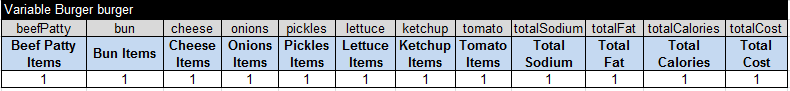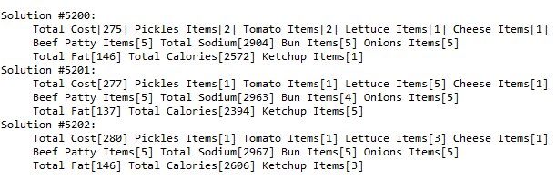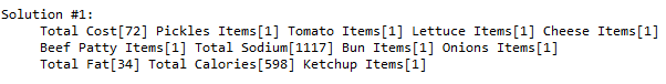 I’ve also added 4 variables for different burger’s totals. The upper bounds of their domains already enforce the final burger containment requirements: