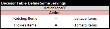 These total-variables may be defined as scalar products of the proper values from the ingredient list above and all (yet unknown) variables. It can be easily done in the following decision table thanks to the standard OpenRules decision table templates: