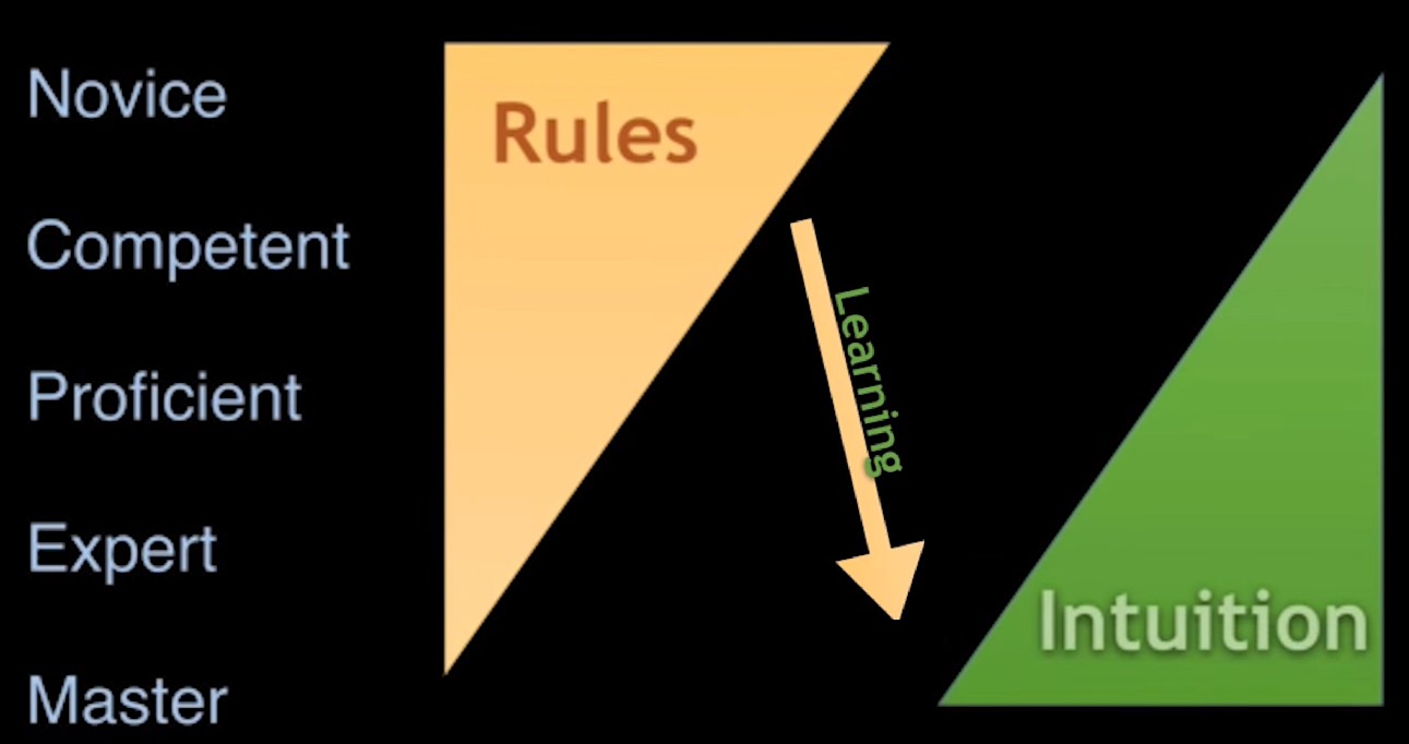 So, Novice humans first learn some rules to become Competent and then Proficient, but to become Experts and even Masters humans are “forgetting” the rules transforming them to Intuition or Tacit Knowledge. These hidden rules become assumed and instead of being explicitly formulated are hidden in an “implicit rules repository” somewhere in human brains.