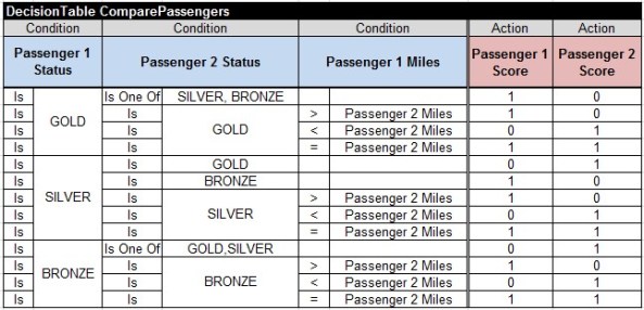 The ActionSort will use the following passenger comparison decision table “ComparePassengers” (that it is very similar to the Edson’s decision table above):