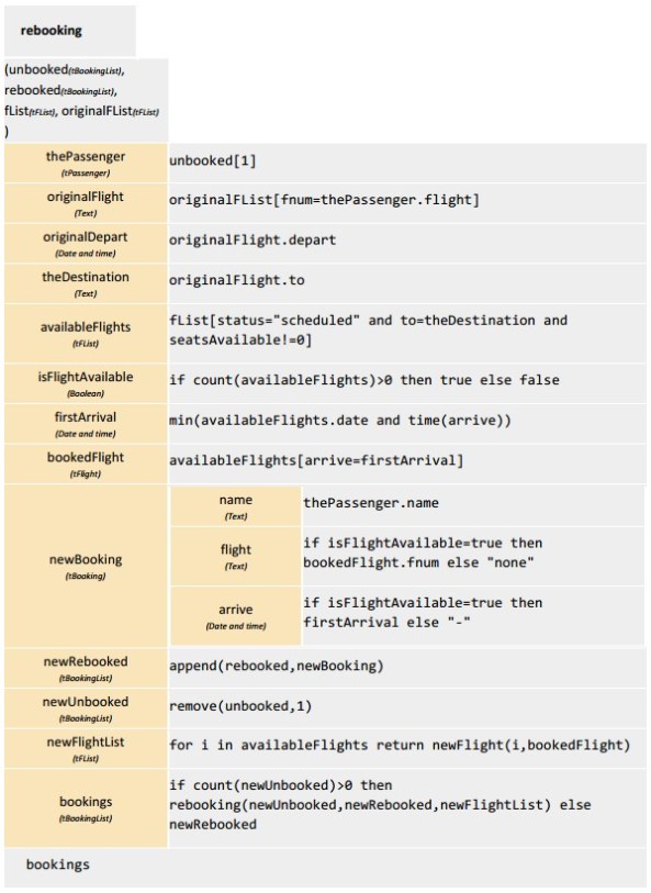 While it is sounds like a quite clear description of the “business logic”,  its representation as an executable decision model is not a simple task. Really, you need to sort lists of passengers and flights,  use tiebreakers, iterate through passenger and flight lists while controlling seat availability. No wonder that well-known DMN experts selected this challenge to demonstrate the most complex DMN constructs. Please take a closer look at the complete, working solutions provided by Bruce Silver and Edson Tirelli. Here I will reproduce only a fragment from Bruce’s DMN-based solution: