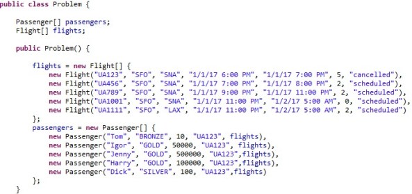To deal with this problem, we will need two arrays Passengers and Flights, which I decided to present in the Java class Problem: