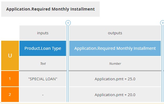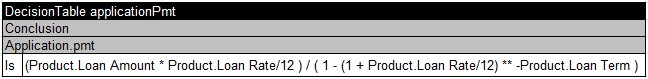 This decision model was converted to Excel-based decision tables in the OpenRules formats. In particular, the literal expression that calculates Application.pmt was converted into an unconditional decision table: