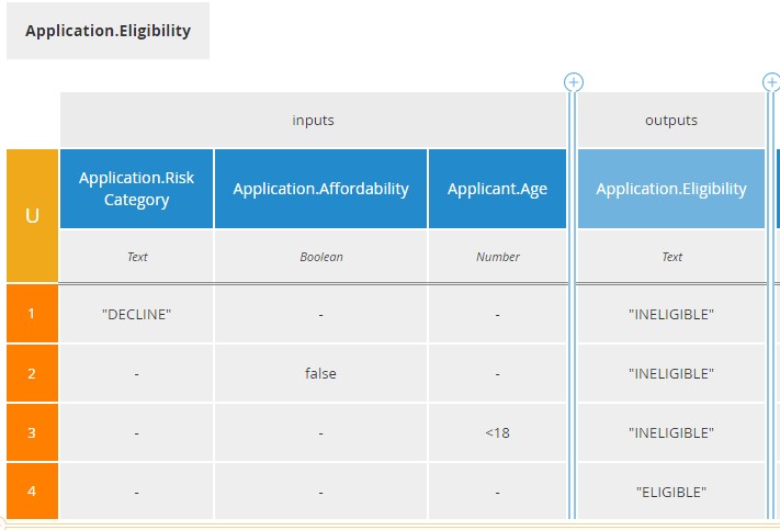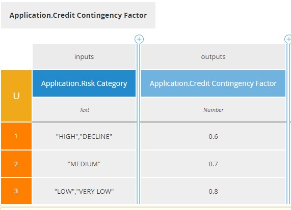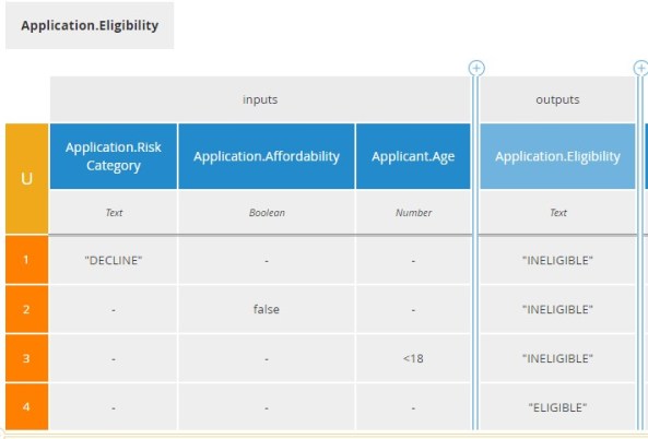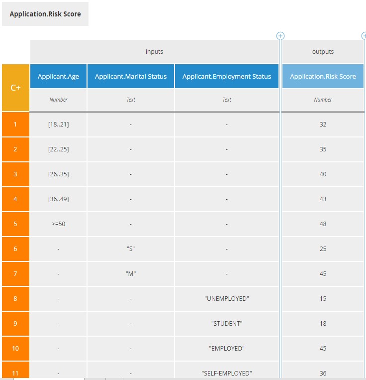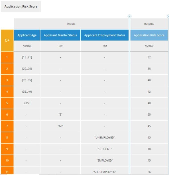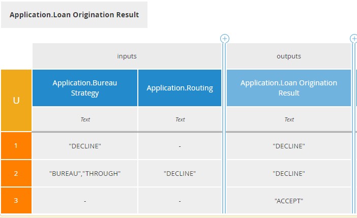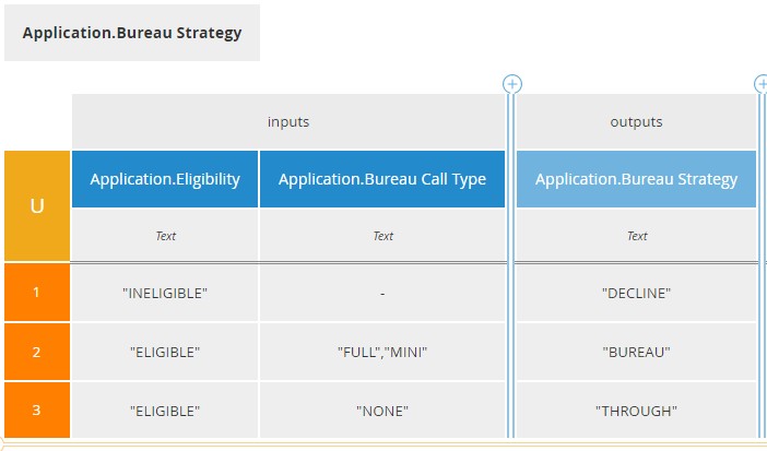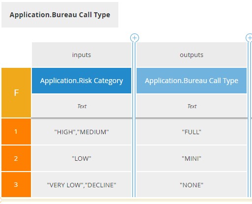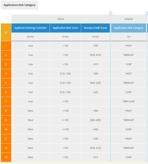 Note that it uses the same decision variable “Application.Risk Category” as the decision model “Pre-Bureau Risk Category” but its decision logic is different.