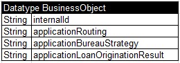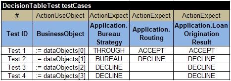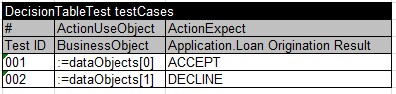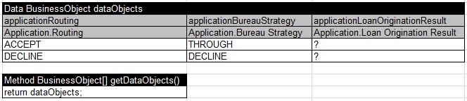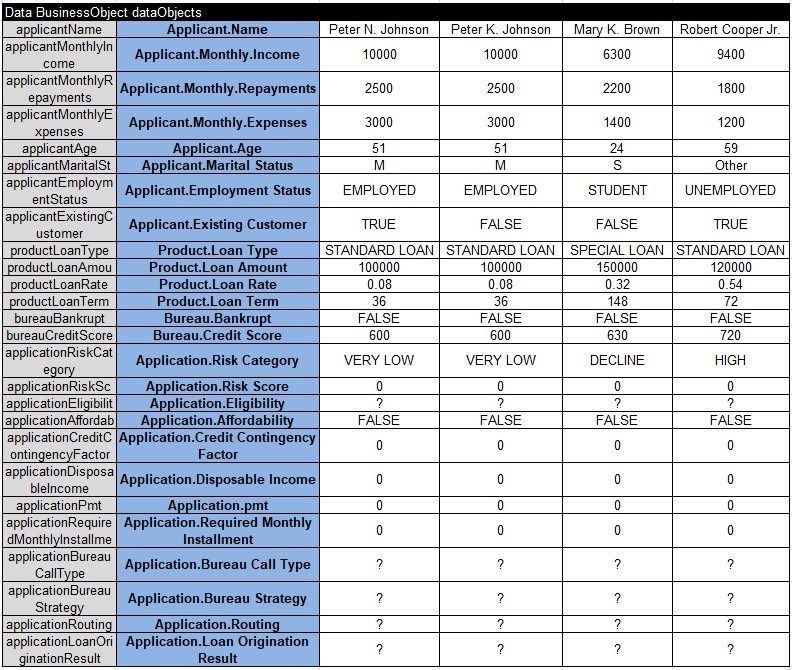 To test the integrated decision, I created the file “LoanOroginationDecision-test.xls” that integrated tables for the datatype “BusinessObject”, data objects, and test cases with expected results. Here they are: