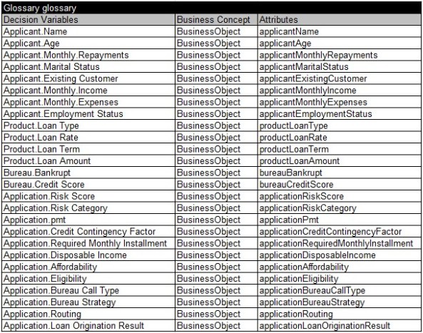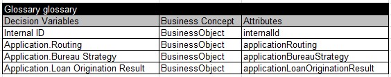 The glossary for our integrated decision will simply combine automatically generated glossaries from our 7 decision models and will look as below: