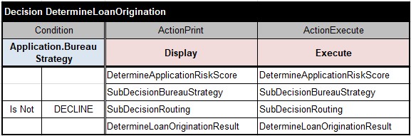 This decision first will execute the common decision model “DetermineApplicationScore” and then “SubDecisionBureauStrategy”. This sub-decision supposed to assign a value ACCEPT, THROUGH, or DECLINE to the decision variable “Bureau Strategy”. If Bureau Strategy Is Not DECLINE, then (and only then) this table will execute “SubDecisionRouting”. And finally this table will (unconditionally) execute the decision “DetermineLoanOriginationResult” to define the main output variable “Loan Origination Result”. Here are these two sub-decisions: