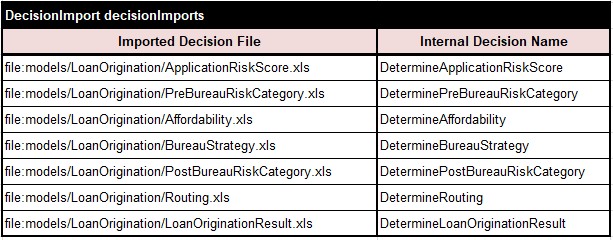 It is possible to link these models together with a BPM engine. However, I wanted to use OpenRules for composing an end-to-end decision model out of these automatically generated models. I decided to import our 7 decision models into one “big” OpenRules-based decision model “DetermineLoanOrigination”. While DMN specifies an importing mechanism, nobody (including Trisotech) supports it yet. So, I decided to use a native importing mechanism provided by OpenRules.