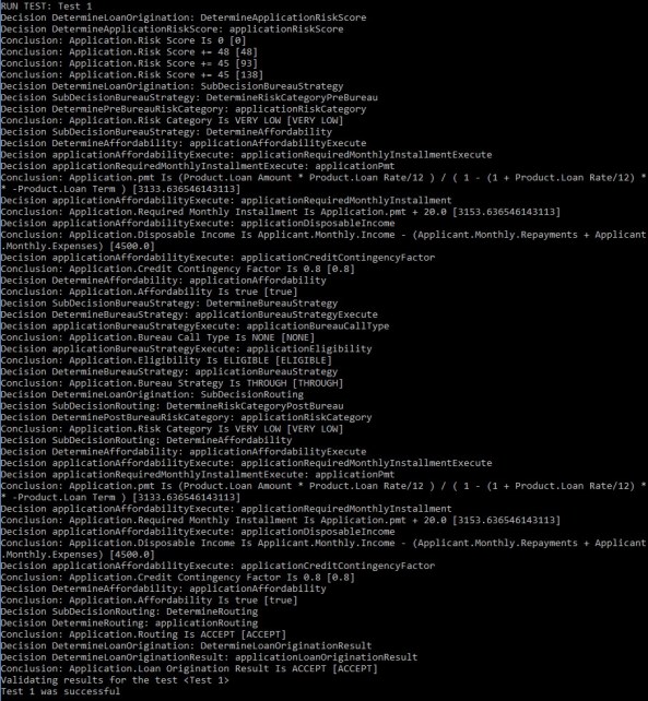 We can see how different decision models were actually executed along with produced values for related decision variable. The final output Loan Origination Result is ACCEPT as expected.