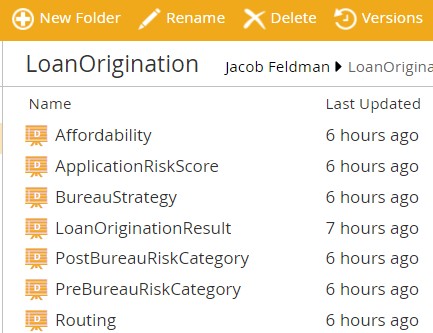 The objective of top-down decomposition of the end-to-end decision logic is to build a “library” of relatively small, loosely coupled decision models which could be tested and executed independently. Then we can link various decision models from this library together to model our “big” problem as long as many other related problems. In my post I’ve already described how we did top-down decomposition of our “big” Loan Origination decision model into 7 loosely coupled decision models. Now I will describe how I implemented all of them using Trisotech graphical interface. All 7 models were created as separate decision models placed in the Trisotech folder “Loan Origination”: