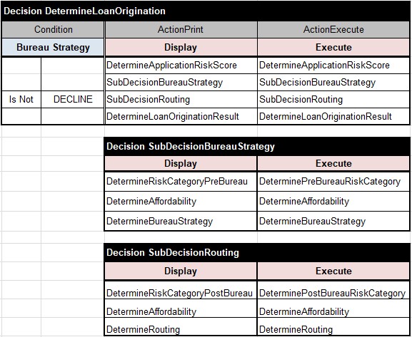 One of the decomposition challenges for this decision model was caused by the fact that clearly reusable decision model “Affordability” requires two different decision variables “Pre-Bureau Risk Category” and “Post-Bureau Risk Category” as its input. So, we decided that two different decision models that define these two variables should rather define the same variable called “Risk Category” that will be used by the decision model “Affordability”. It immediately made these 3 decision models loosely-coupled. You can read more about the actual implementation here.