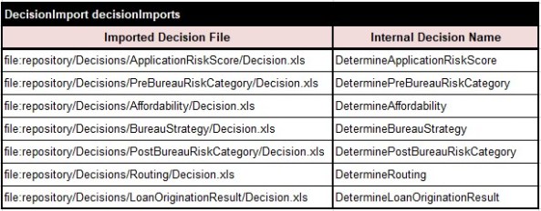 It is possible to use a Business Process Management (BPM) engine to integrate these decision models as decision tasks of one “big” business process. However, the latest release of OpenRules offers a special table of the type “DecisionImport” that simply imports smaller decision models allowing a bigger decision model to use them without any changes. Here is an example of “DecisionImport”: