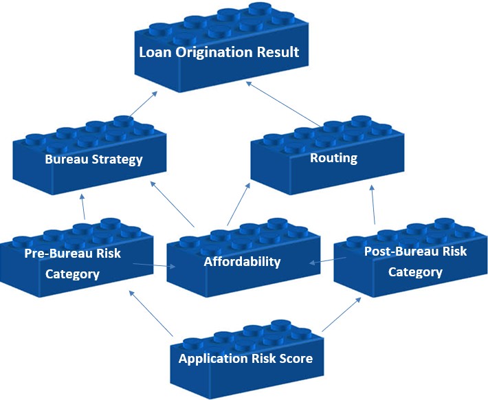 | Lego pieces can be assembled and connected in many ways, to construct objects; vehicles, buildings, and working robots | Predefined decisioning constructs that can be assembled and connected in many ways, to construct working business-specific decision models |