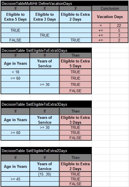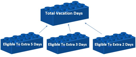 As you can see, we decomposed one, relatively complex decision model in 4 smaller decision models (in this case, simple decision tables). Like in LEGO, we started with a assembling a foundation piece without worrying what we will put on the top of it later on. In this case the “foundation” is the first decision table that defines the variable “VacationDays”. This multi-hit decision table uses as its input 3 decision variables produced by other single-hit decision tables, which set eligibility variables for 5, 3, and 2 extra days.