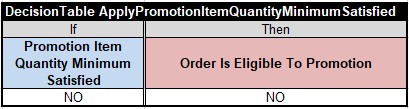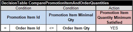 By executing this decision table we will define the variable “Promotion Item Quantity Minimum Satisfied” as “YES” or “NO” for every promotion item relatively to the selected order.