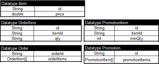 As we don’t want to use Java (yet), to complete our decision table in Excel we need to define data types for all PromotionItem, Promotion, OrderItem, and Order: