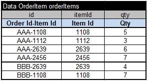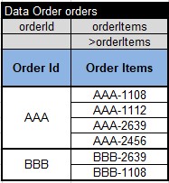 Now let’s create several orders. Each order has a unique id, say “AAA” and “BBB” and an array of order items included in an order. Here is an example: