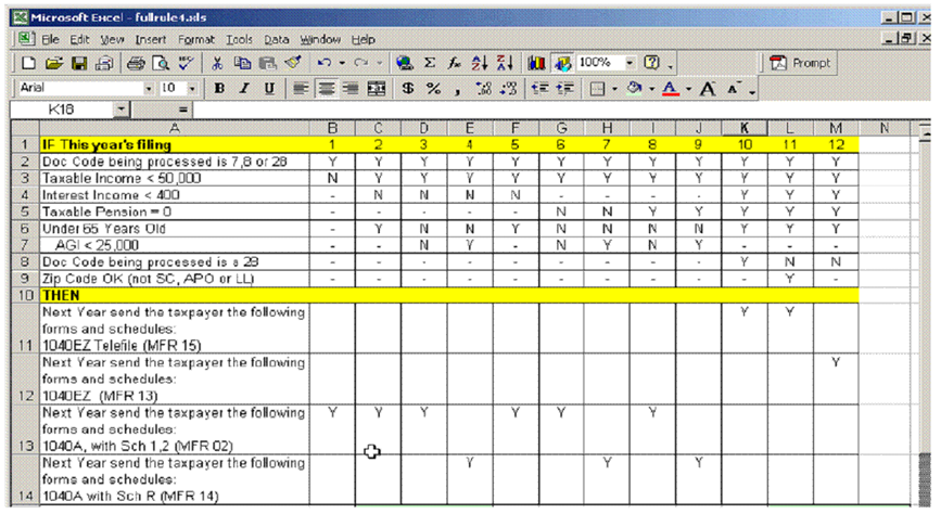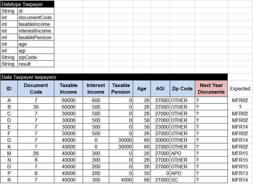 According to the challenge, this table was provided by a tax business analyst with no additional comments. Mike found the problems, “consulted” with the table’s author regarding uncovered combinations of different attributes, and came up with much smaller decision table. While I like Mike’s solution, my concern is that the resulting decision table is so much different to compare with the initial one. Usually business analysts have some serious reasons to organize their rules in a certain way: what if the new, “optimized” decision table is missing some business knowledge that its author had in his/her mind while creating the initial table? So, I tend to agree with Bob’s analysis that probably the initial table after all was not so bad. These considerations forced me to create an OpenRules-based implementation of this decision table.