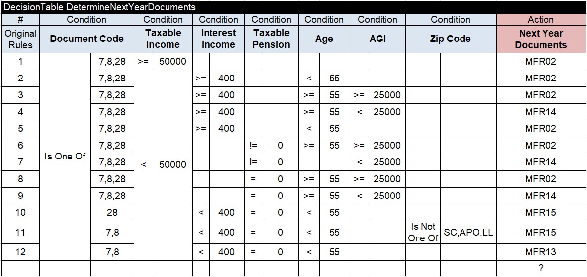 These changes were minimal and hopefully it is easy to recognize the initial table. I put the initial rule numbers in the first column and even did not delete the Rule 5 that is identical with the Rule 2 – what if the business analyst reserved this rule for something else she planed to introduce later on? The only important change is my additional rule at the end of the table, which will be executed when there are no matching rules – it will assign ‘?’ to the resulting variable “Next Year Documents” (the default rule). This table looks like a quite typical DMN first-hit decision table.