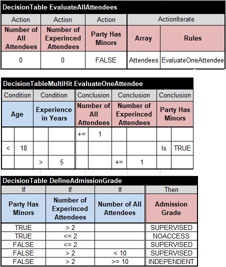 Jan rightfully noted that this “syntax may unnerve some business users“. But can we offer more traditional decision tables to business users that still represent the complex logic that deals with a collection of “Persons” attending a Party? A year ago I proposed how to avoid programming when we deal with collections of objects. Here are my decision tables that implement the same logic as above: