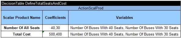 To define variables “Number of All Seats” and “Total Cost” I used the predefined action “AddScalProd” in the following Excel table: