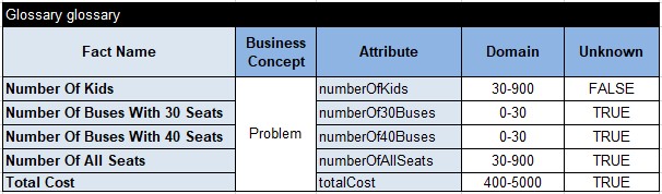 So, it took me about an hour to do it in OpenRules with Rule Solver. Now I will describe my solution here. You can see the implementation in this Excel file DecisionZooBusesKids.xls. As usual for business decision modeling I started with the business glossary: