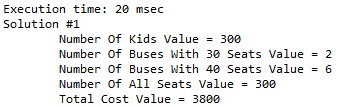 The decision variable “Number of Kids” is comes as a known input (300). The decision variables “Number of Buses With 30 Seats” and “Number of Buses With 30 Seats” are our main unknowns, and I decided that their possible domain are between 0 and 30 (to cover at least 900 kids). There are two more unknown decision variables “Number of All Seats” and “Total Cost” that depend on previous two variables. We need to minimize “Total Cost” while making sure that “Number of All Seats >= Number of Kids”.