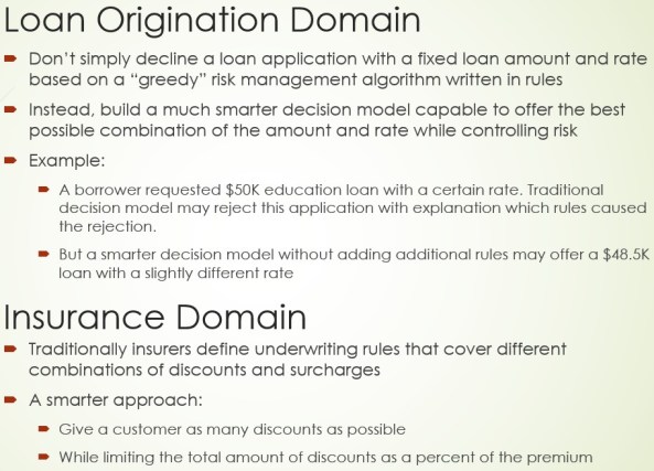 In particular, I pointed out that one of the most typical complexities of decision modeling is exception handling when an decision analyst is trying to cover all possible situations using rules with multiple exceptions. While exceptions usually occur in less than 10% of real-world cases, exception handling takes more than 90% of decision modeling efforts. The necessity to represent multiple exceptions on top of other exceptions is frequently caused by the fact that decision modelers are trying to represent the existing (!) business logic. Such decisioning logic was defined before decisions were automated and when decision makers were doomed to follow some deterministic, frequently greedy algorithms. However, if we try to find out the actual reasons for exceptions, we may discover business rules that were hidden in minds of subject matter experts (Ron Ross calls them “tacit rules”). When it is practically impossible to cover all possible situations (various combinations of decision factors), decision modelers take shortcuts that lead to decisions which are far from optimal.