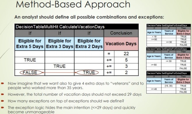 Note that the 3rd row in the above decision table “CalculateVacationDays” implements this rule: “Give extra 2 days only if you you haven’t already given extra 5 days“. Why extra 2 days cannot be combined with extra 5 days? Probably, the real reason for this rule was to limit a total number of vacation days while giving as many as possible extra days, which this employee is eligible to. Adding more extra days of eligibility conditions may create a real mess if we continue to use the method-based approach and will try to compare different eligibility criteria with each other.