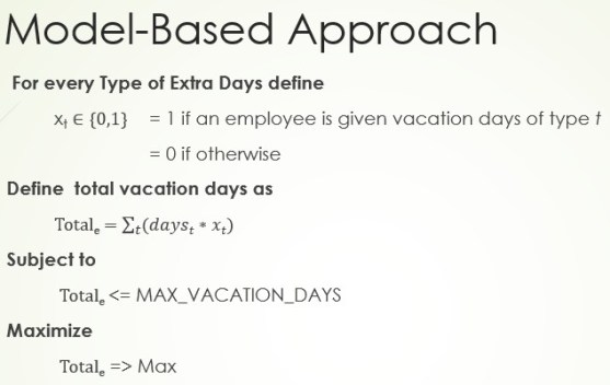This approach not only eliminates all rules about relationships between different types of vacation days. It also replaces a one “greedy” path to solution with an ability to find a true optimal solution.