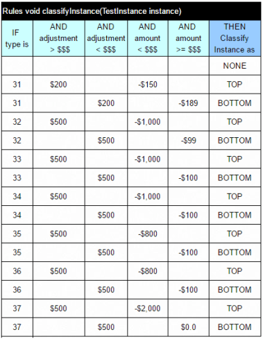 When we applied a similar approach to much larger decision tables, we could receive smaller rulesets that produced “almost the same” results. However, there were always some incorrectly classified cases. In some situations, when a small number of classification errors are acceptable, this could be a good practical approach. No wonder: smaller rules sets require much less maintenance and work much faster! But let’s look at the negative side of this approach. We should always remember that in certain applications the errors could be critical and not acceptable (for example in medical decision making). But more importantly, let look at the above example more attentively. In the manually created rules, the classification was a function of three attributes (type, adjustment, and amount) while the automatically generated rules depend only on one attribute “amount” with a “magic” threshold -159. Is it good or bad? It depends! If we forget an initial ruleset and rely only on the generated one, we will lose the important business logic used by subject matter experts. What if they decide to add another important attribute and the old rules already gone? What if adding more test-instances will bring other attributes to the game?