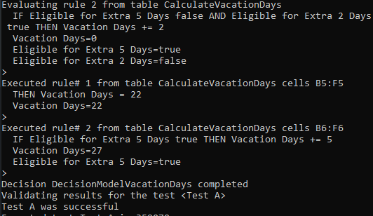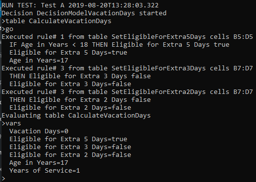 Let’s start again by double-click on “run.bat”. This time we want to debug only the table “CalculateVacationDays”. To do this, we may enter the command “>table CalculateVacationDays” and then “>go“. The debugger will show all executed rules (without stopping at them) and will stop only before evaluating the table “CalculateVacationDays”. You may display all variables at this moment by typing “>vars“. Here is what you will see: