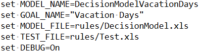 Let’s consider how we can debug our popular decision model “Vacation Days” described here. Usually a user clicks on the batch file “build.bat” to build the decision model, and then on “run.bat” to execute it. The model itself is described in the file “settings.bat” that in case of “Vacation Days” looks as below: