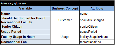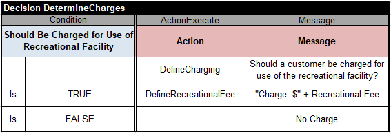 If “Should be Charged for Use of Recreational Facility” is TRUE, then the second sub-decision “DefineRecreationalFee” will calculate the Recreational Fee using the following decision table: