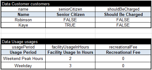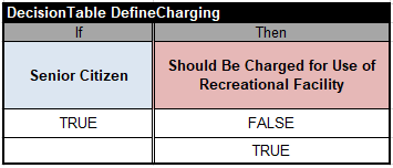 First, we execute sub-decision “DefineCharging” that answers to the first Ron’s question by setting the decision variable “Should be Charged for Use of Recreational Facility” to TRUE or FALSE. The following decision table implements this logic:
