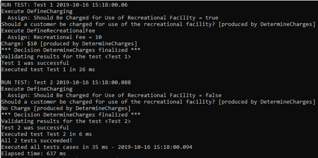 After executing this sub-decision, the high-level decision “DetermineCharges” will also print the calculated charge amount, e.g. “Charge: $10”.