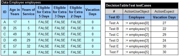 Our customers for years used OpenRules test-cases defined in the tables such as these ones for the decision model “VacationDays”:
