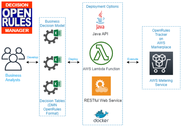 You still may create and test your business decision models locally using only Excel and File Manager. Then you with one click may deploy using Java API, or as a AWS Lambda, or as a RESTful Web Service, or as a Docker Container. Thus, you are in complete control of your decision modeling and execution environment. You integrate your OpenRules-based services with your decision-making applications the way you prefer. With a SaaS Subscription every time when your application executes an OpenRules-based decision service this execution will be reported to AWS Metering Service for the correct billing at the end of each month. Here is the high-level architectural diagram: