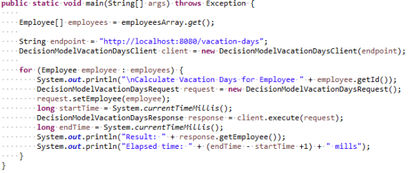This program first creates a client using the automatically generated Java class DecisionModelVacationDaysClient. For every employee defined in the Excel file “Test.xls”, this program will create a request for this employee using the automatically generated Java class DecisionModelVacationDaysRequest. Then this client will execute this request against our service “vacation-days” and will return a response of the type DecisionModelVacationDaysRequest (that also was automatically generated by OpenRules Decision Manager):