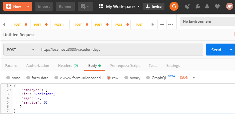 You need to select the HTTP method “POST”, enter the service URL http://localhost:8080/vacations-days, and in the tab “Body” enter an input data in the JSON format: