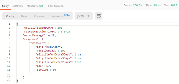 Pay attention that input data starts with the object name “employee”. When you click on the button “Send”, this request will send this JSON input to our web service “vacation-days”, which will respond with a JSON response: