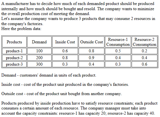 This problem was used as a basic example of a linear optimization problem by JSR331 and JavaSolver. Of course, I again wanted to create a nice, easy-to-use GUI that defines as many products as a customer wants and that calls a remote decision optimization service to quickly receive optimal decision. In this case, such decision will recommend how many products should be produced internally and how many should be purchased to minimize the total cost. Here is how I did it.